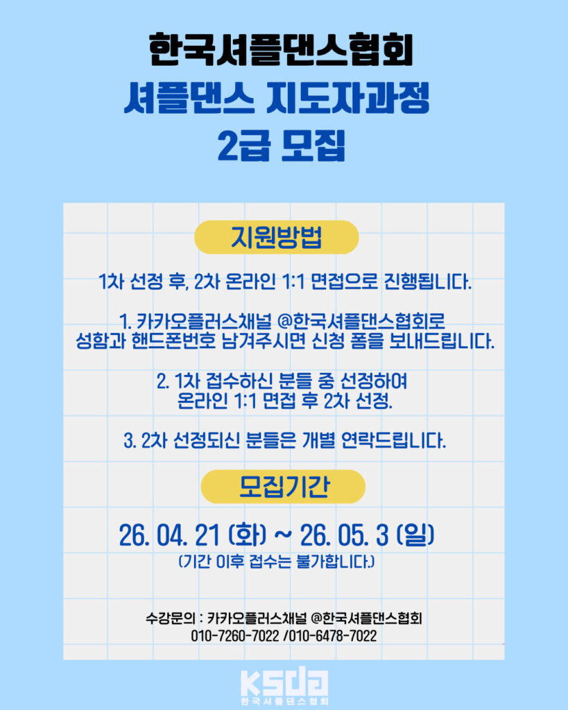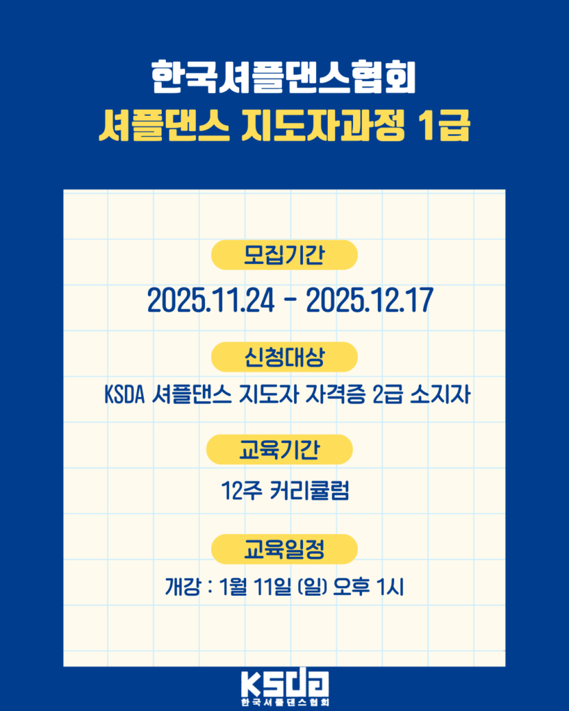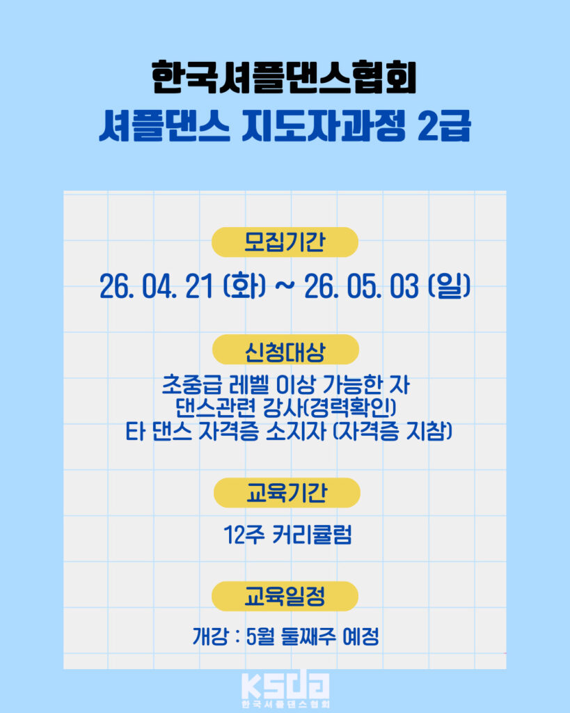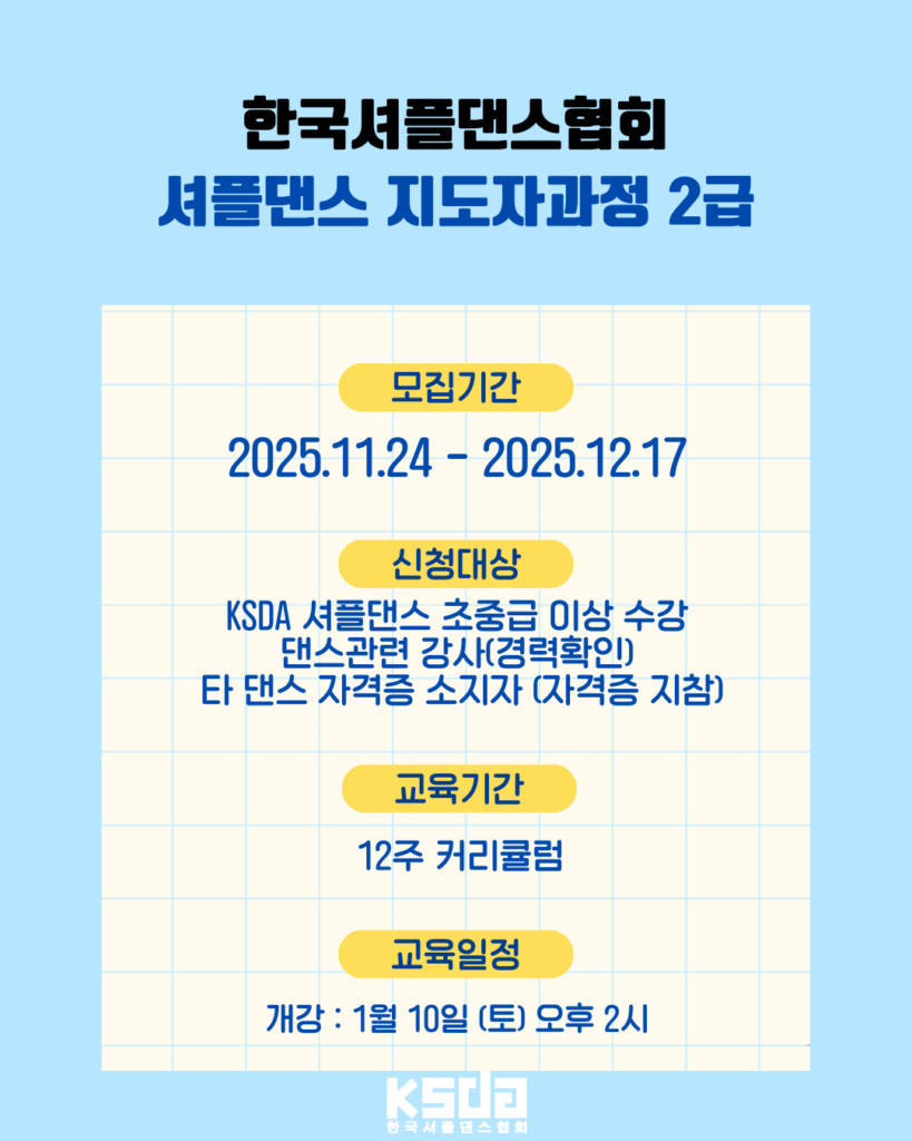 KSDA 셔플댄스 초중급 이상 수강 댄스관련 강사 (경력확인) 타 댄스 자격증 소지자 (자격증 지참)