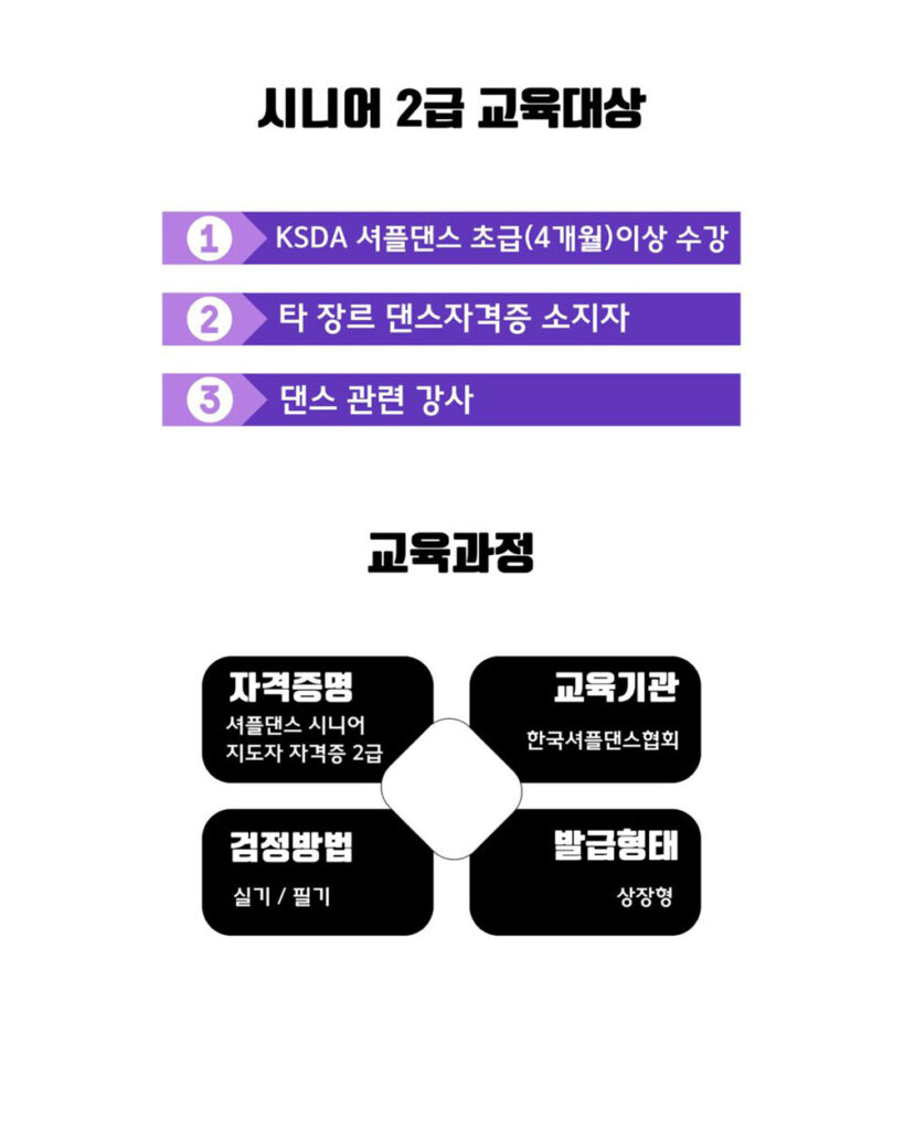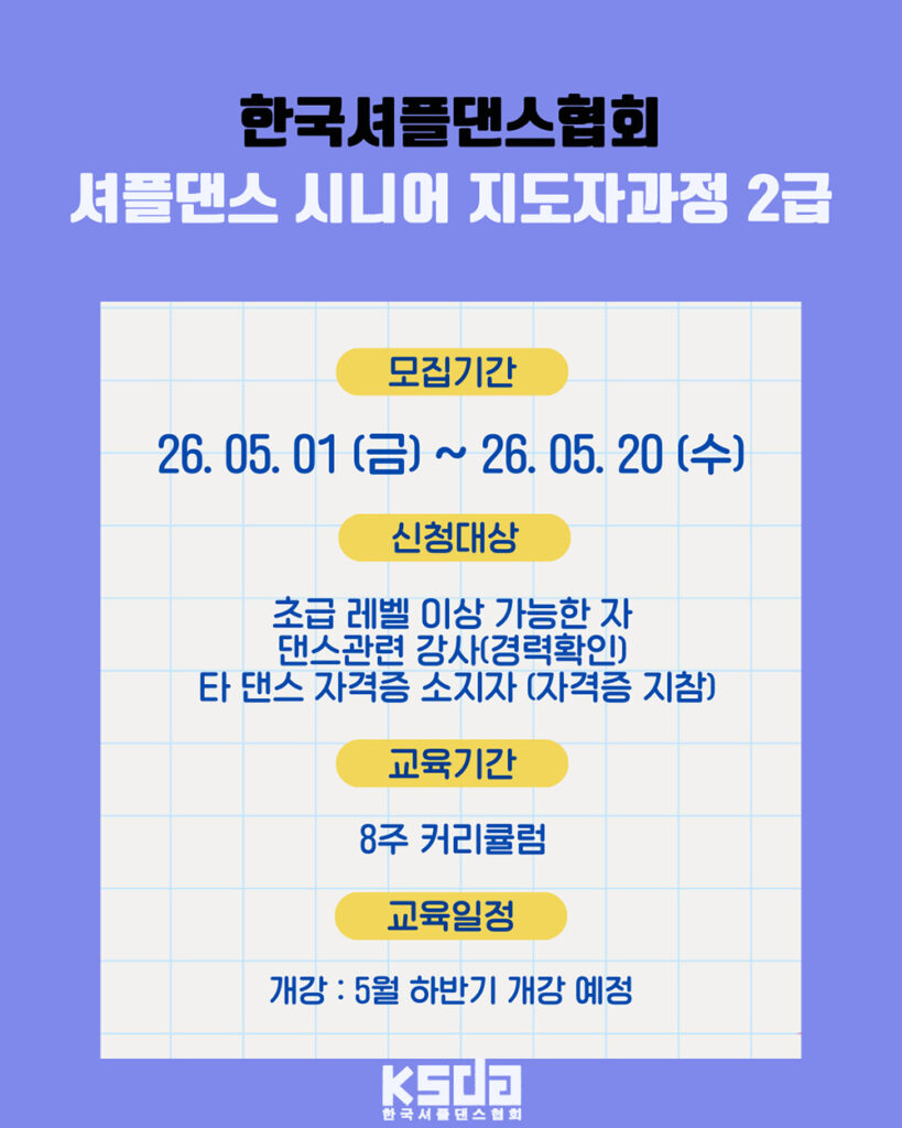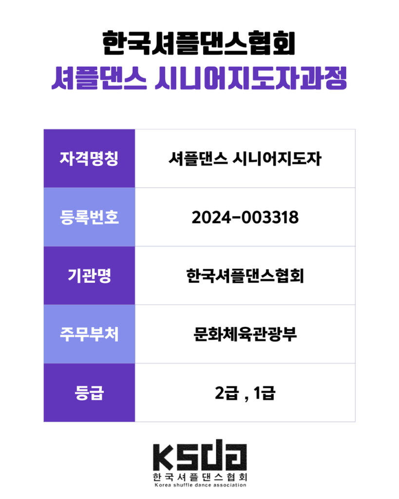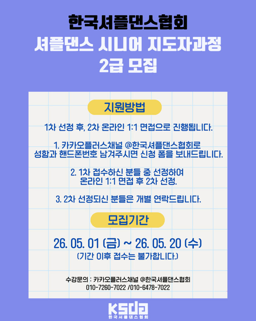 KSDA 한국셔플댄스협회는 셔플댄스 대중화를 위해 앞장서겠습니다! 셔플댄스 시니어 지도자 자격증 과정에 도전 하세요. 카카오플러스채널 @한국셔플댄스협회로 성함과 핸드폰번호 남겨주시면 신청폼을 보내드립니다.모집기간 : 2026. 05. 01 ~ 2026. 05. 20연락처 : 010 – 7260 – 7022 / 010 – 6478 – 7022